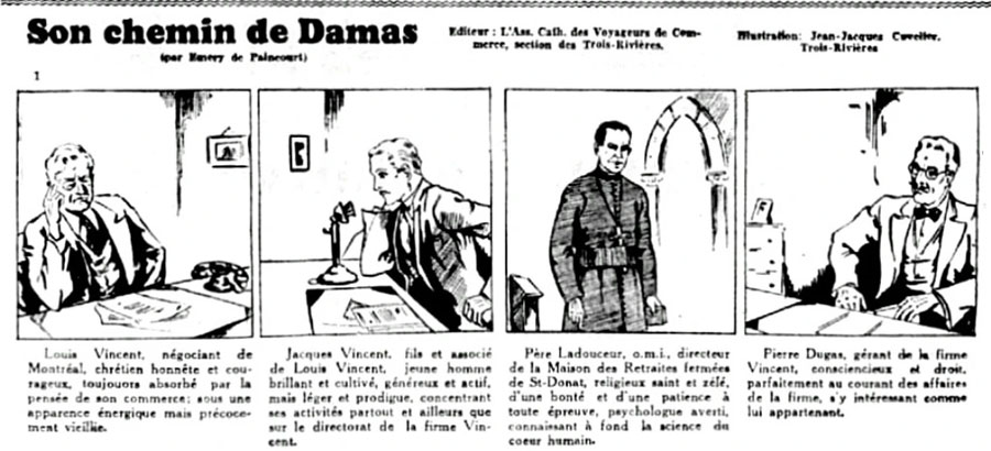 In addition to his work as a sculptor, Cuvelier drew several newspaper comic strips, through the Catholic Association of Commercial Travelers Trois-Rivières Section (L'Association Catholique des Voyageurs de Commerce Section des Trois-Rivières). Between 1935 and 1938, the newspaper L'Action Catholique ran eleven adaptations of Québec novels which promoted French-Canadian roots and the Catholic religion. Jean-Jacques Cuvelier illustrated several of them, most notably 'Son Chemin de Damas' by Reverend Alfred-David Emery Curé de Paincourt. It consists of 87 strips, published between 20 May and 20 August 1937. Interesting is that the strip started out as a text comic, like most of the other serials, but eventually switched to speech balloons. The story was also reprinted in Le Devoir, Le Nouvelliste and Ma Gaspésie.