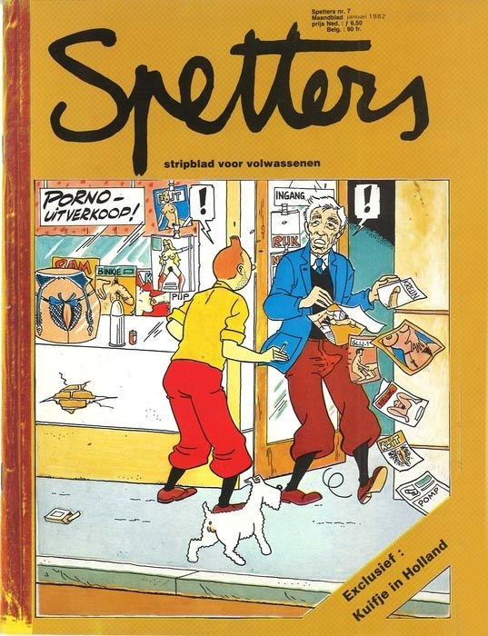 Bucquoy threw even more oil on the fire by introducing a deliberately offensive 'Tintin' parody in the same issue. Titled 'Kuifje in Holland', the cover alone shows readers directly what they're in for. It shows Tintin about to enter a sex shop, while crossing paths with his creator, Hergé, who leaves with a bunch of nudie pictures and a huge erection barely hidden in his pants. According to Bucquoy's editorial, the story inside was written by the Surinamese Pieter-Jans and drawn by "the world famous Swedish comic artist" D'Arcosta. It followed the sexual vulgarities one would expect from an average porn parody, but with a more political-satirical dimension. Tintin meets chief editor V.J. (which stands for "Vuile Jood" ("Filthy Jew"), according to a caption, and gets recruited as a Nazi. Together with Captain Haddock he blows up a bunch of Jews and travels to the Auschwitz concentration camp to exterminate even more victims. Bucquoy explained that he deliberately wanted to piss off Hergé.