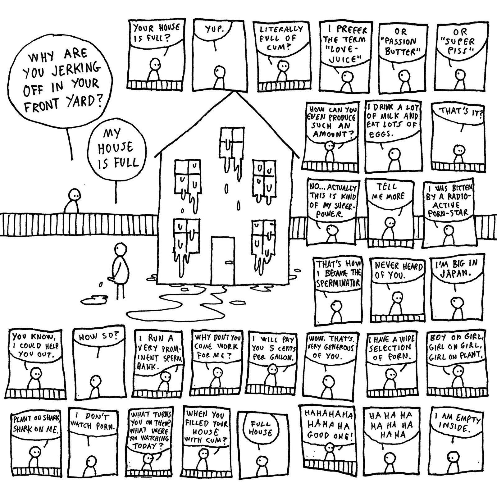 Hugleikur Dagsson quickly gained notability with his minimalistic cartoons and comics. They have no recurring characters, only simple stick figures. The topics are dark and bleak. Spousal abuse, alcoholism, rape, suicide and depression are just some of the themes he tackles with his ironic humor. In interviews, Dagsson has attributed his style to the Icelandic landscape and climate. His country has a harsh, rocky environment and a small population. The weather is cold and during wintertime there is only three hours of daylight. It's no wonder that Iceland, like other Northern European countries, is often stereotyped for being depressing. Dagsson explained that his people therefore have a tendency to point at the horrors of life and laugh, which he feels is very therapeutic. However, he also admitted that his minimalistic drawing style wasn't much of an aesthetic choice, but mostly a way to save time.