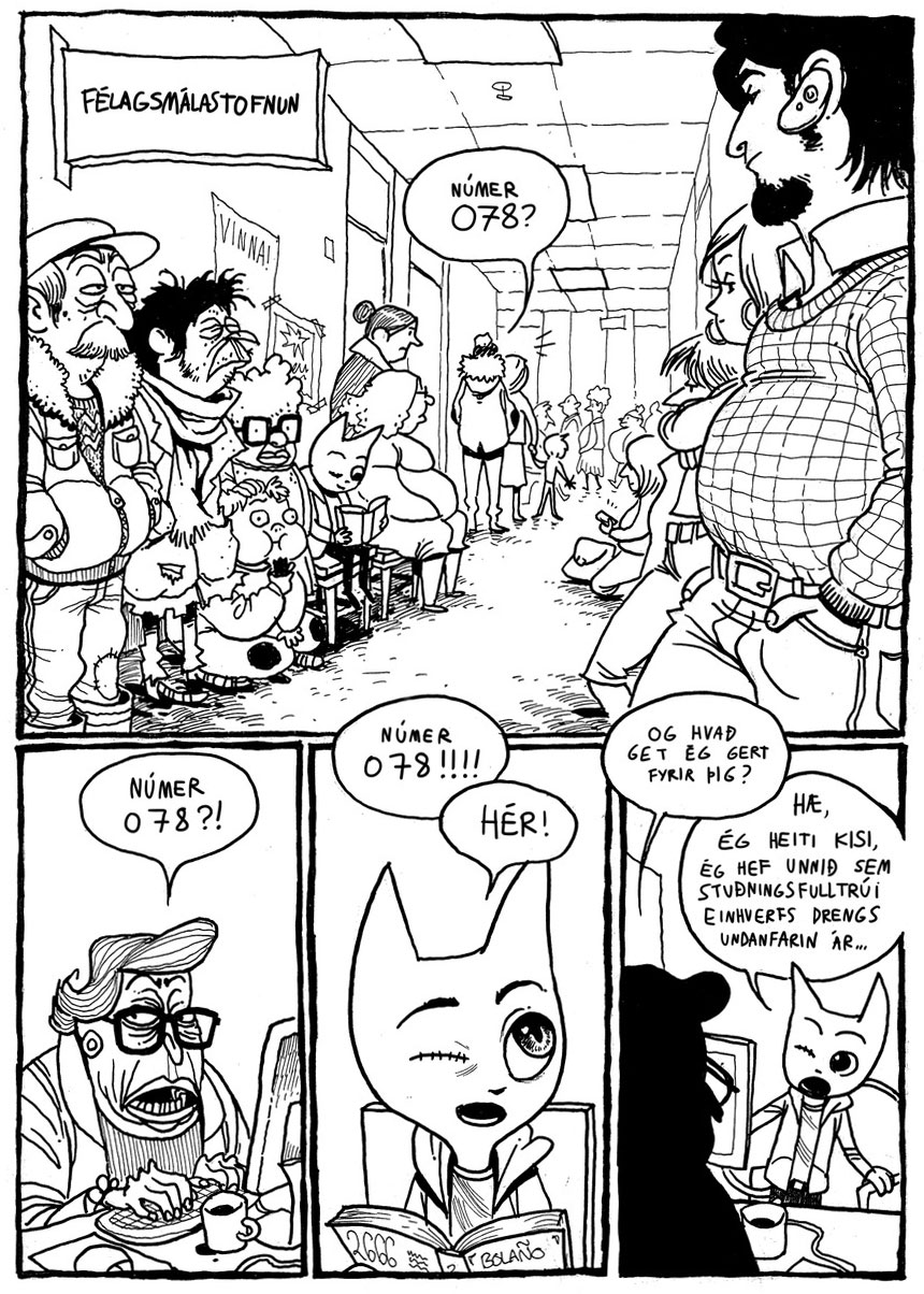 Háðfuglinn Hugleikur Dagsson was born in 1977 in Akureyi, a town in the central north of Iceland. His father is the historian Dagur Þorleifsson, and his mother, Ingibjörg Hjartardóttir, is a librarian, novelist and playwright. When the boy was 10 months old, his family moved to Sweden. By the time Hugleikur was six, the family returned to Iceland, so their son could be schooled in his native language. Around the same time, he drew his first childhood comic strip, 'Skrímslaeyjan', about a man stuck on a dinosaur island. The plot was inspired by the album 'Adèle et la Bête' from Jacques Tardi's 'Adèle Blanc-Sec' comic series. As a child, Dagsson often played together with his nephew, the future painter Þrándur Þórarinsson (1978), making drawings and doing role playing games. His uncle Þrándur stimulated him to continue making absurd, black comedy, which encouraged the boy to become either a film director or a comic artist. But the Icelandic comic industry was very limited and most people saw the medium as cheap children's entertainment. The only comic store in his immediate vicinity was Nexus, founded in 1979 in the capital Reykjavik. Interviewed by the magazine MBL on 16 July 2006, Dagsson went so far as to claim that "Nexus saved me." Apart from Tardi, he has cited Frank Miller and Alan Moore as important influences.