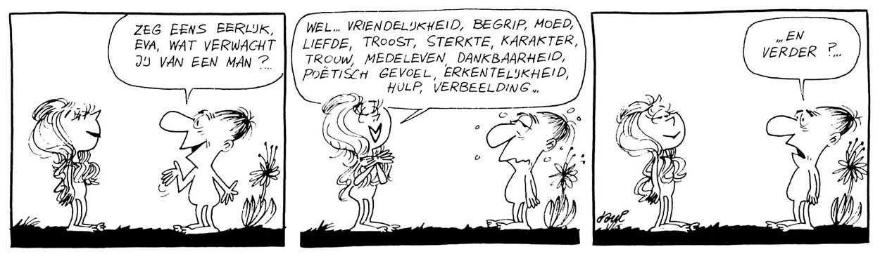 'Adam en Eva'. Translation: "Tell me honestly, Eve. What do you expect from a man?" - Eve: "Well, kindness, understanding, bravery, love, comfort, strength, character, loyalty, compassion, gratitude, feeling for poetry, acknowledgement, help, imagination,..." - Adam: "And else?".