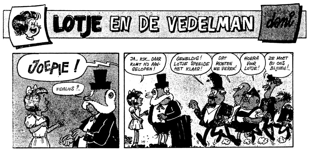 From 1974 on, Dacquin was a mainstay in Patskrant, the children's supplement of the newspaper De Standaard, which changed its name to the Stipkrant in 1977. In its pages, he drew his longest-running comic features, 'De Lotgevallen van Lotje' (sometimes titled 'Sprookjesavonturen van Lotje', 1974-1980), a humorous adventure comic about a young girl. About 11 stories were published, often co-scripted by Dani's brother Fernand or his wife Lieve Zeghers. In 1975, Dacquin co-illustrated the book 'Lach Maar Liever Met Pietje Pennewip' (Lannoo, 1975), a compilation of episodes of 'Pietje Pennewip', a Patskrant column written by Cyriel Verleyen with illustrations by GoT. That same year, he also livened up the pages of Eugeen Decamps' 'Koken in het Klein' (Lannoo, 1975), a compilation of the similarly titled culinary column in Patskrant.