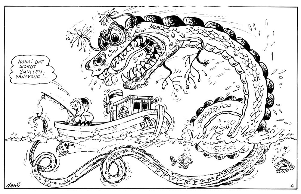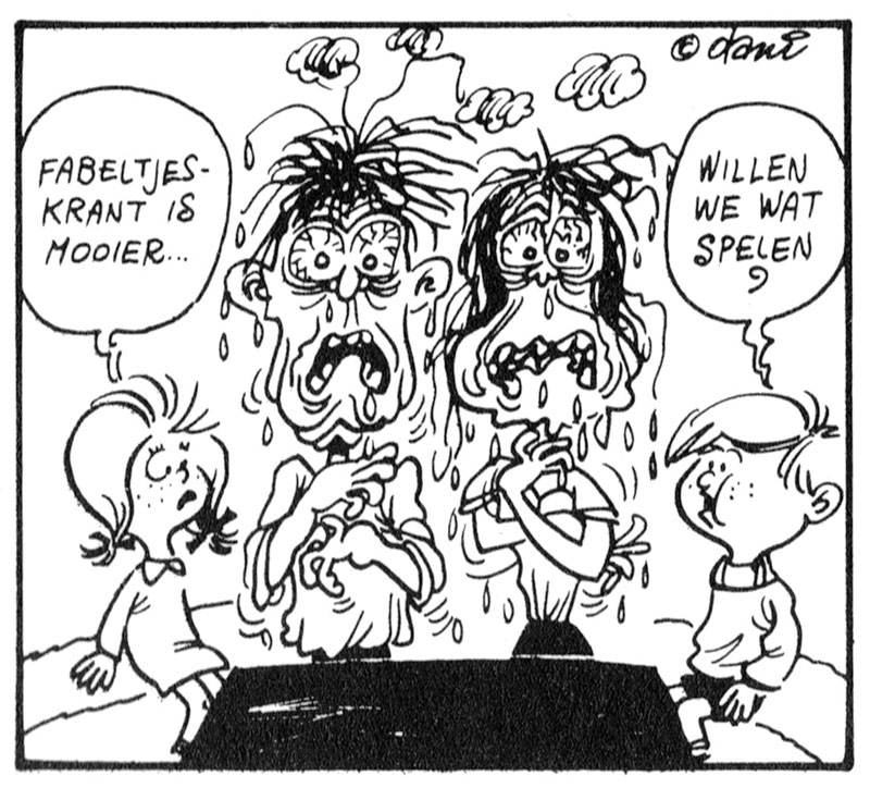 With 'Tele-Dani-Visie' (1969), published in the Flemish newspaper De Gazet van Antwerpen, Dacquin found his niche: a comic strip poking fun at recent TV broadcasts and media celebrities. Some were direct spoofs of TV shows. A decade later, he created a similar TV parody series, 'Televiviesektie' (1974), which ran in the weekly opinion magazine Knack.