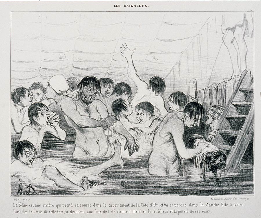 Apart from 'Les Poires' (1831), Daumier made other prototypical comics. At the instigation of Charles Philipon, chief editor of Le Charivari, Daumier created the text comic, 'Les Mésaventures de Mr. Gogo', which appeared in the December 1838 issue of the short-lived magazine La Caricature Provisoire, also owned by Philipon. Between June and September 1839, Daumier created 'La Journée du Célibataire' (1839) for Le Charivari, a humorous text comic about the trials and tribulations of a bachelor. Another text comic by Daumier, 'Les Baigneurs' (1847), mocks swimmers in bath houses and at beaches. The humorous depictions of clumsy and awkward people trying to stay afloat and avoid looking ridiculous in their swimming costumes are accompanied by dialogue underneath the images.