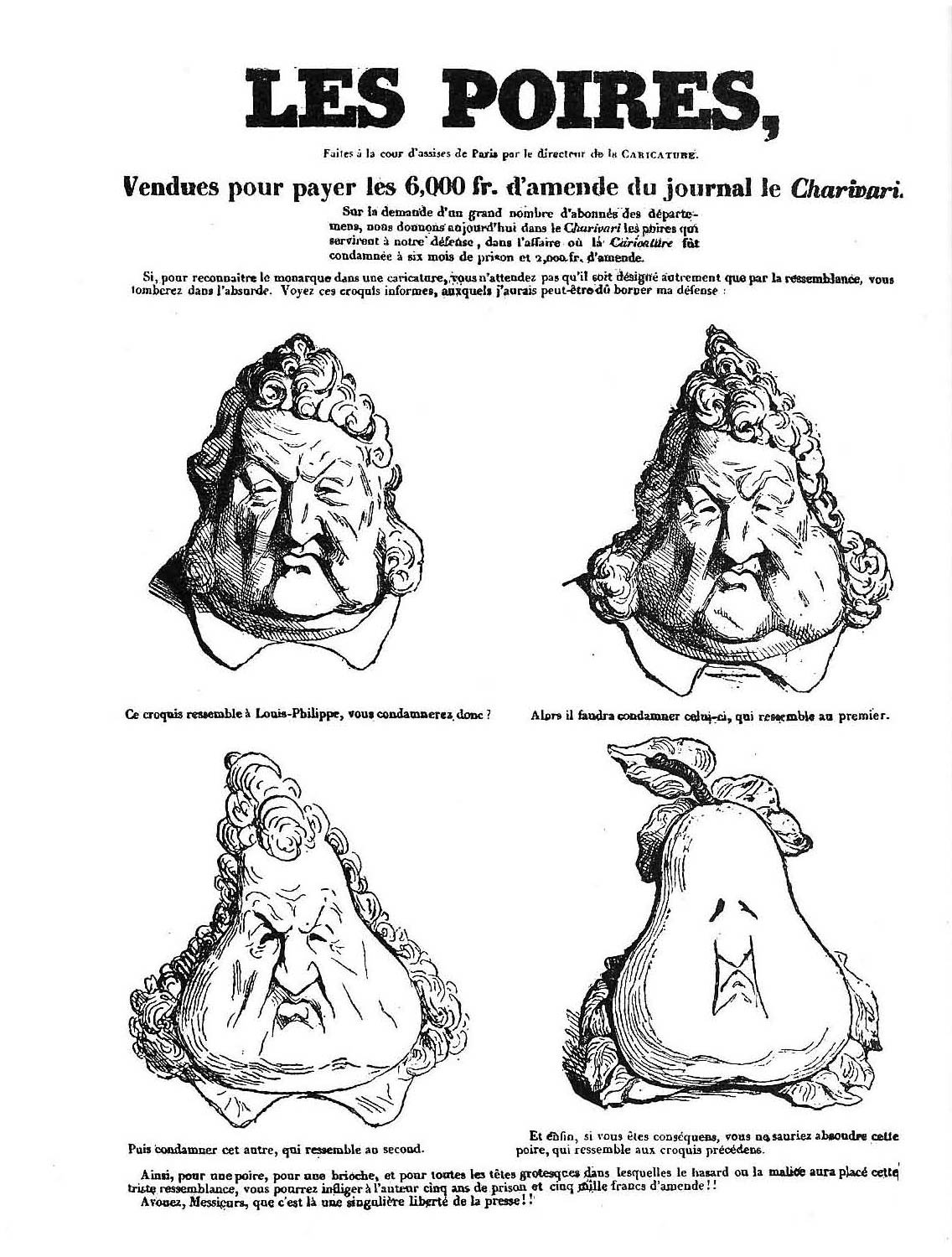 In 1829, Daumier met Charles Philipon, editor of the magazine La Silhouette, where he published his first drawings. A year later, Philipon founded the satirical magazine La Caricature, where cartoonists such as J.J. Grandville, Jules David, Victor Adam and Daumier found a place to publish their work. Daumier became notorious for his sarcastic portrayals of French society, satirizing politicians, clergymen, judges, the bourgeoisie and even king Louis Philippe. In 1831, he drew a caricature of the king, depicting him as a pear. This led to an official complaint from the French government. Daumier defended himself by drawing another cartoon, 'Les Poires' (1831), in which he "proved" the monarch's resemblance to a pear by portraying it in a gradual transformation. Daumier's cartoon is also interesting for comic historians, since he uses a four-panel sequence to achieve his effect. At the time, republican activists quickly adapted the image in their struggle to depose the tyrant. The sequence was scribbled on many walls, making the monarch the laughing stock of the country. 'Les Poires' has become one of the most iconic political cartoons of all time and a classic textbook example of "lèse-majesté" ("offending His Majesty").