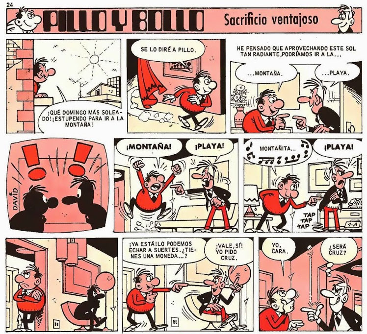 By 1971, Redo worked for the Bruguera publishing house himself, assisting house cartoonist Manuel Vazquez with the inking of his pages. Later on, David created his own features. First in Sacarino (1975) and then in El DDT (1978), he created the humor comic 'Pillo y Bollo'. In a 2013 interview with the mortadelo-filemon.es fansite, David recalled that his feature was intended as a male counterpart to Vázquez's 'Las Hermanas Gilda', about two sisters of opposite characteristics who live together. In Mortadelo magazine, he additionally drew 'Rufo' strips and cartoons.