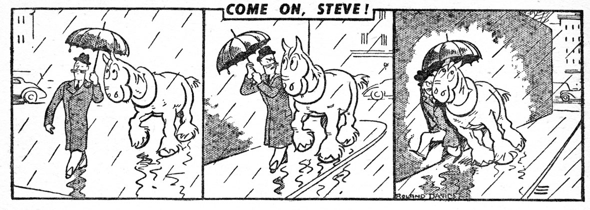 Oddly enough, Davies' first long-running comic strip dealt with a traditional means of transport, namely a horse. On 6 March 1932, the pantomime gag comic 'Come On, Steve!' (occasionally spelled without a comma too, 1932-1949) made its debut in The Sunday Express. All gags centered around an intrusive but essentially good-natured carthorse named Steve. His name was a tribute to famous champion racehorse jockey Steve Donoghue. The comic strip was popular at the time and led to a few annual compilation books and twelve color picture books. In 1939, the Sunday Express dropped 'Come On, Steve!', which motivated the cartoonist to move to a different paper, the Sunday Dispatch, where the antics of good ol' Steve continued until 1949. Davies published political cartoons for this same paper under the pseudonym "Rod".