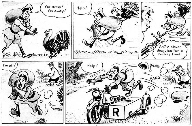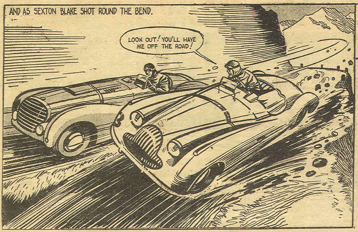 After World War II, Davies was an artist for the Teddy Tail Annuals, based on Charles James Folkard's comic strip from The Daily Mail, by then drawn by Arthur Potts and later William St. John Glenn. But it was his post-war comic strip 'Sparks and Flash' (1949) in Sun that led him back to his old love and expertise for stories involving motor vehicles. 'Sparks and Flash' was a humor comic about a racing car. The magazine's editor, Leonard Matthews, became convinced that Davies would be a natural to create more dramatic adventure comics too. Soon Davies drew seven episodes of the classic detective series 'Sexton Blake' (1949-1952), a character originally created by novelist Harry Blyth in 1893. Sexton's thrilling adventures had been visualized by illustrator Eric Parker before and since 1939 the character also had his own comic strip in Knockout, where he had been drawn by Jos Walker and Alfred Taylor. 'Sexton Blake' offered Davies plenty of opportunities to draw exciting chase scenes on cars, motorcycles, trains, motorboats and airplanes. In 1961-1963, some older episodes of 'Sexton Blake' were recycled in Knockout as part of the 'Pete Madden' series. Davies also created a comic strip adaptation of the 1950 western film 'Ambush' for Knockout. Roland Davies is often credited for drawing 'Jill Crusoe' (1950-1959) in the AP's girls magazine School Friend, but this artist was more likely Reginald Ben Davis.