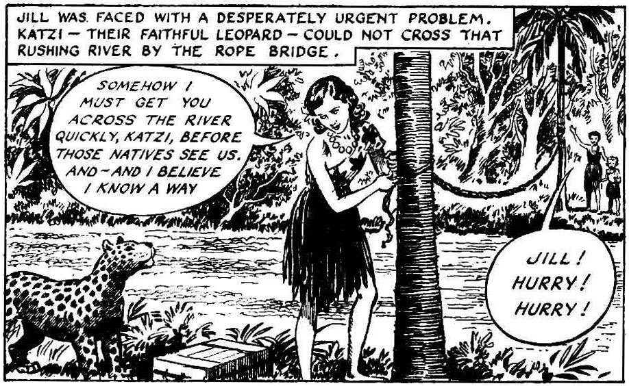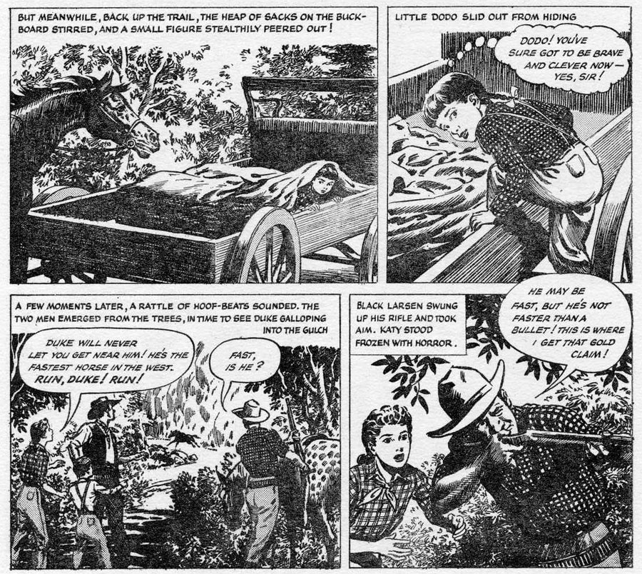 Equally adventurous creations for School Friend by Davis were 'Jon of the Jungle' (1951-1952) and 'The Boy Who Guarded Faraway Isle' (1959-1957), two serials starring girls joining expeditions and treasure hunts in respectively the African jungle and a little known island in the South-Seas. 'Lost in Red Man's Land' (1953-1954) dealt with a family of American pioneers, heading for Oregon. It was a predecessor to Davis' other major contribution to School Friend, the long western feature about 'The Jackson Family' (1957-1960), set in 1890s Kentucky. In the original sixteen-month serial, 'Katy of Cedar Creek' (1957-1958), the brave Katy Jackson tries to win the Grand Prix with her tamed wild horse Duke, in order to save the family ranch from the evil Crowley. Davis reused Katy and her two siblings in short stories published in the School Friend Annuals of 1959 and 1960. Another serial appeared in School Friend magazine in 1960, this time drawn by E.C. Julien.