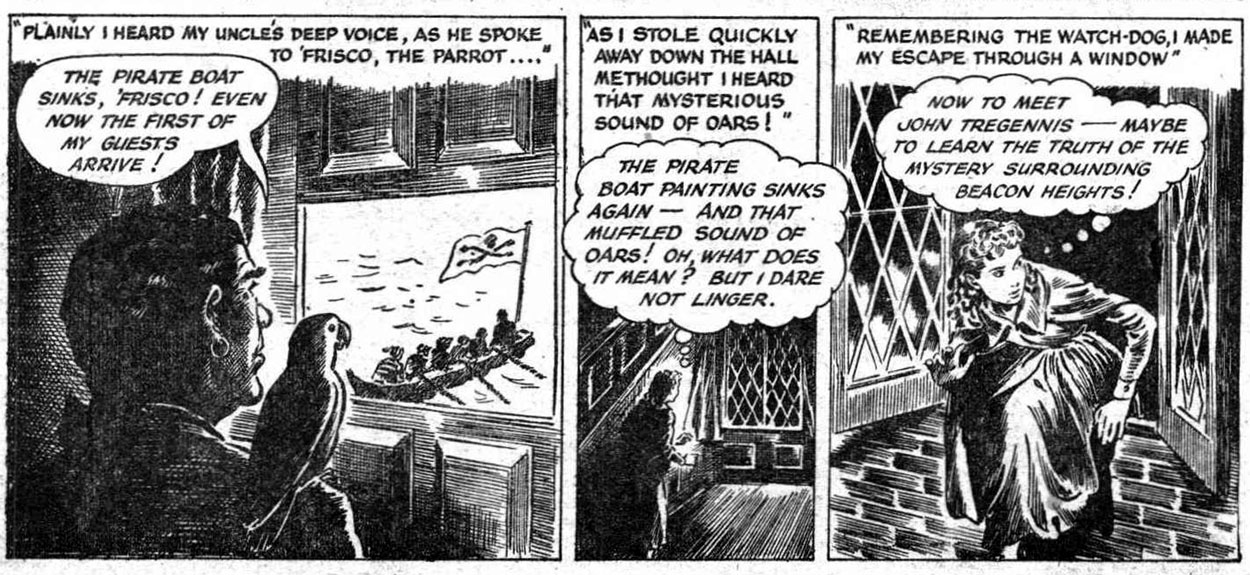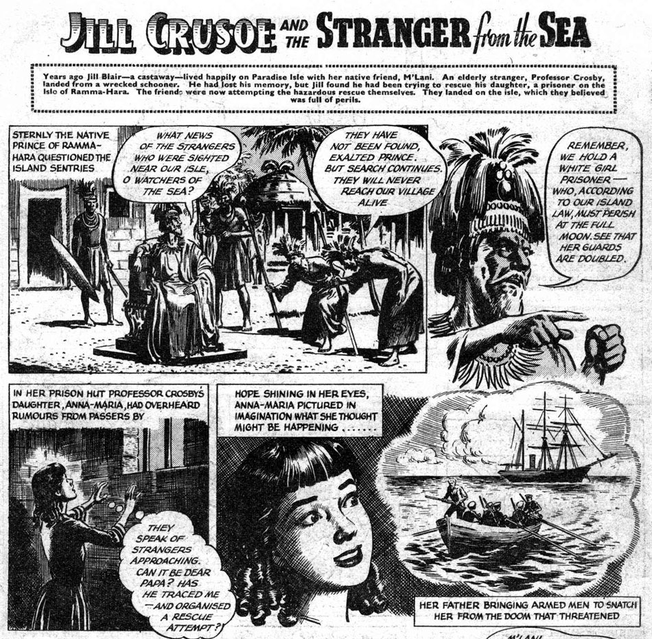 Reginald Davis' best known and longest-lasting feature was 'Jill Crusoe, Castaway' (1950-1959), a female version of the classic 'Robinson Crusoe' story. Jill's adventure began in the first issue of School Friend, when she shipwrecked in the middle of the Indian Ocean, while on her way to Australia. Her adventures among the island's natives and jungle animals proved popular enough to last through the decade. After the first serial came the sequels 'Friends of Paradise Isle', 'The Mystery Schooner' (AKA 'The Land of the White Queen', 1952-1953), 'The Golden Bell' (1954-1955) and 'The Stranger from the Sea' (1959), while the characters also appeared in School Friend's annuals and its Picture Library. For a long time, Roland Davies was credited as Jill's artist, but in later years, Reginald Ben Davis has been identified as the feature's actual illustrator.