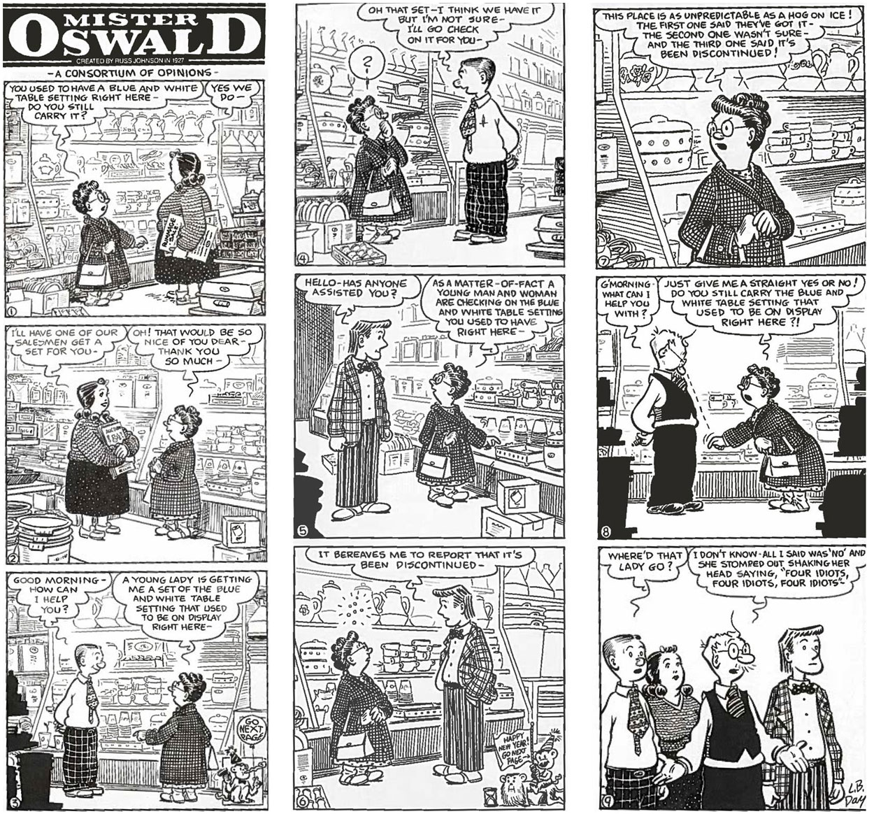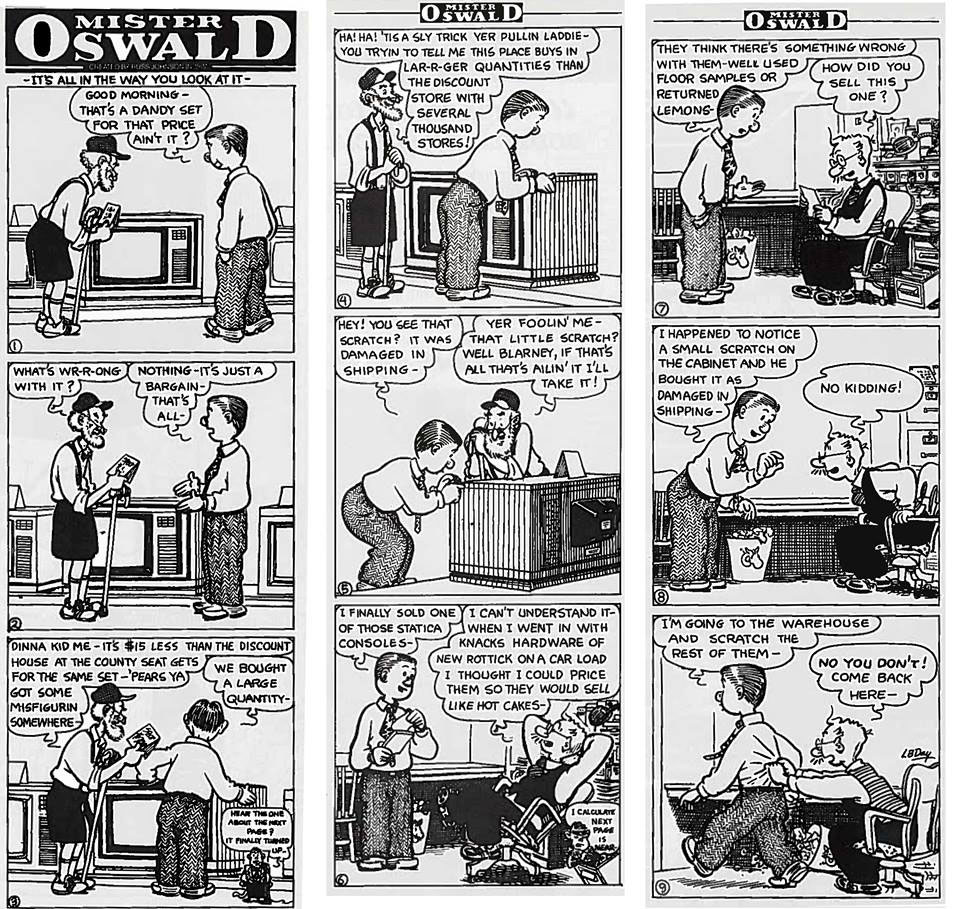 From the early 1980s on, he also served as an assistant for Russ Johnson on the 'Mister Oswald' comic strip, which had run in the monthly trade journal Hardware Retailing ever since 1927. Johnson and Day (both born in the same town) worked together for eight years, as Johnson's eyesight was gradually failing. By 1989, well into his nineties, Johnson retired and officially handed the strip to Day. Since Day had no background in retailing, and Johnson had devoted 62 years of his life to his strip, Johnson kept a close watch over the procedures until his death at age 101. Day continued Johnson's life work until 2008, trying to maintain the strip's recognizability among retailers. With an uninterrupted run of 82 years, 'Mister Oswald' serves as one of the longest-running ongoing comic strips in the world. It is however often overlooked by historians, since it ran solely in a niche magazine.