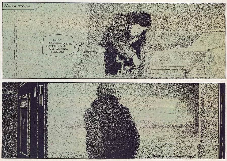 De Luca returned to comics for a first time in 1967, with the melodramatic story 'L'ultima Atlantide', and then for good in 1969 with the western feature 'Bob Jason'. Il Giornalino first published De Luca's best-known serial from 1970. Together with writer Gian Luigi Gonano, he created the adventures of crime fighter 'Il Commissario Spada'. The series was groundbreaking in many ways, since it introduced subjects like violence, organized crime, satanic sects, terrorists and murderers to the pages of a Catholic magazine for young readers, that, at the time, was mainly distributed in parishes. However, the duo continued the adventures of their hero until 1982.