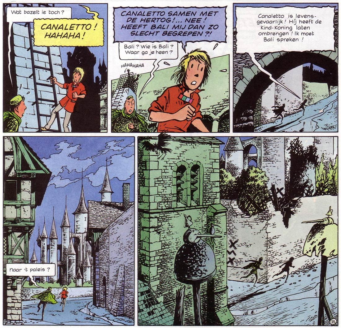 After leaving Studio's Hergé, Johan De Moor teamed up with his childhood friend Stephen Desberg to create the fantasy adventure series 'Gaspard de la Nuit' (Casterman, 1987-1991). Named after the piano suite by Maurice Ravel, the series was filled with fantasy creatures, mystery and parallel universes, rooted in traditional Flemish fantasy tales and legends. In the debut story, an eight-year old boy called Gervais enters a mysterious dispensary, where a collection of masks on the wall seems to observe him. One of them is of a slightly older boy, who asks for his help. When Gervais takes the mask home and puts it on, he turns into the other boy, known as "Gaspard de la Nuit" ("Gaspard of the Night"). From then on, the dreamy hero's reality changes. He can choose between the world of the humans - devoid of fantasy and whose existence seems devoted to work - and that of the small people of the night, where musicians, actors, elves, dragons and unicorns gather. He chooses the latter, kicking off a series of baroque fantasy adventures. The first three books formed an ongoing coming-of-age narrative, in which Gaspard searches for his own identity, the fourth installment was a stand-alone story. 'Gaspard de la Nuit' appeared in Dutch under the title 'Kasper', and was serialized in Eppo/Wordt Vervolgd and Sjors en Sjimmie Stripblad.