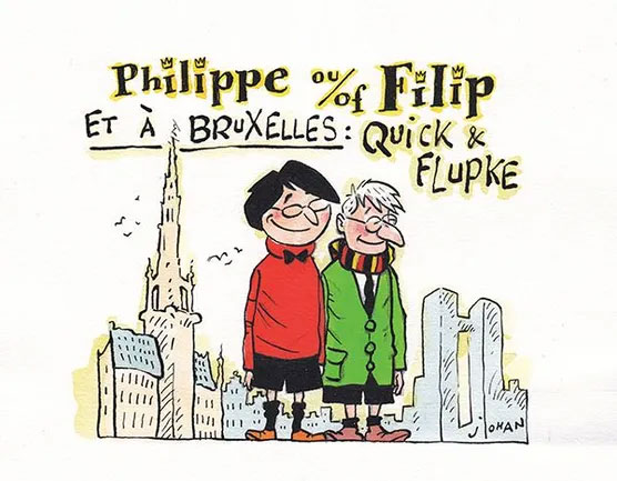 Cartoon spoofing Hergé's 'Quick & Flupke' characters, with Belgian Prime Minister Elio Di Rupo and king Filip/Philippe.