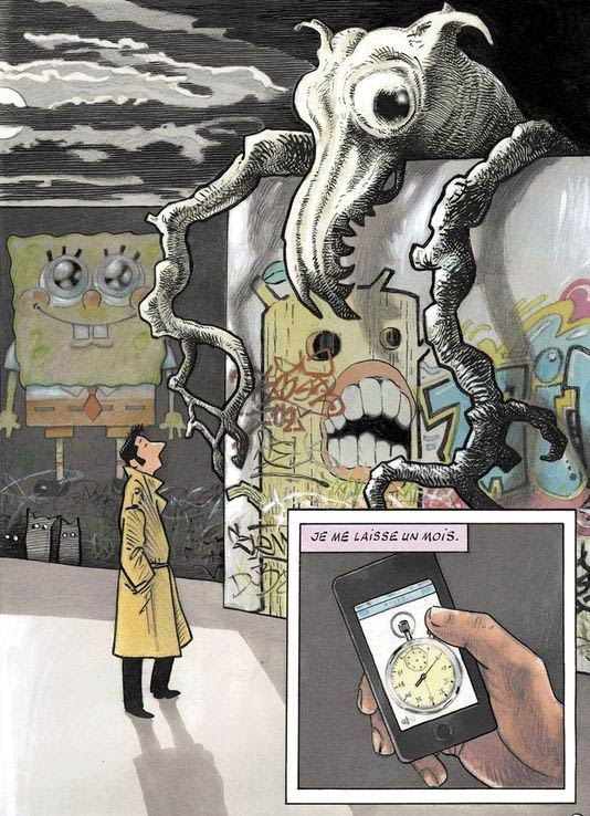 'Coeur Glacé'. The monster peering over the wall is a nod to Gustave Doré's big-eyed gnarled monster from his illustrations to 'The Days of Chivalry, or the Legend of Croquemitaine' by Ernest L'Épine. In the back appears Stephen Hillenburg's 'SpongeBob Squarepants.'