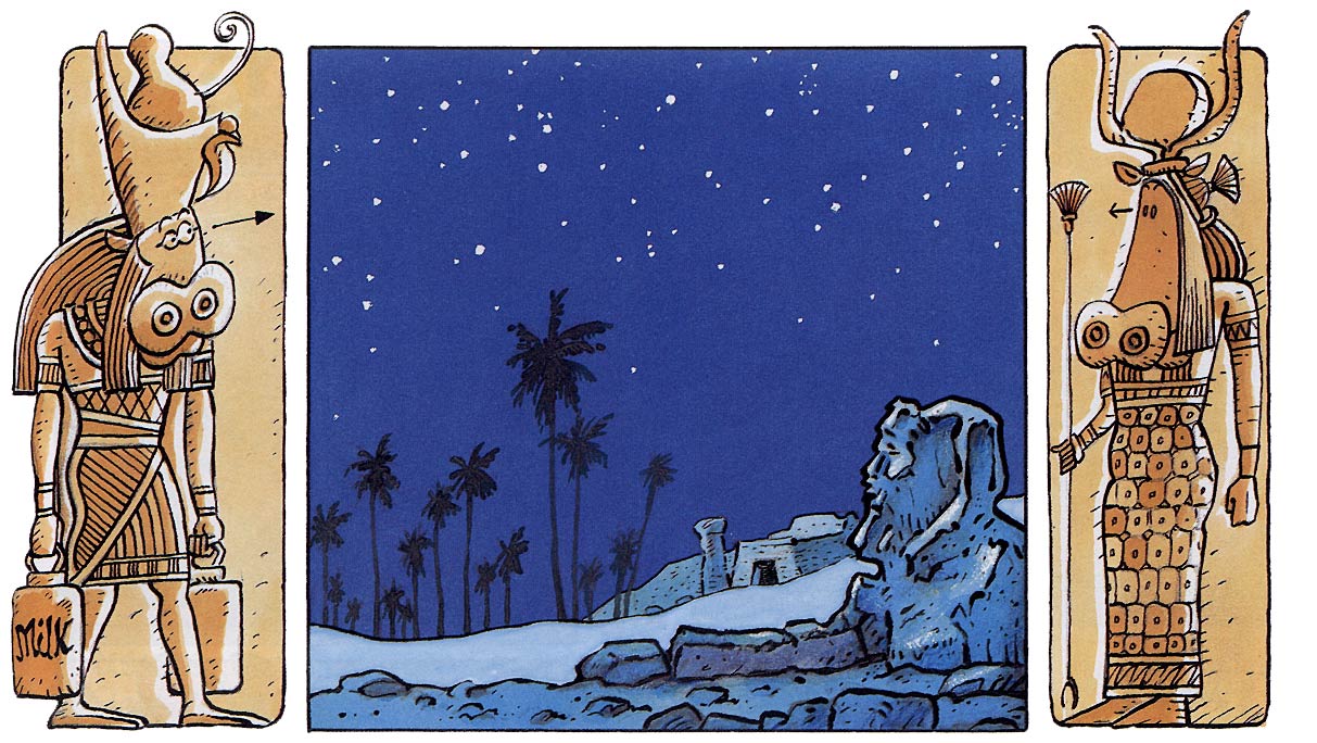 While creating 'Gaspard de la Nuit', Johan De Moor had gradually found a more personal style, freed from the Clear Line influences of Hergé and his father. For his next comic, he turned to even more graphic experiments. Again with Stephen Desberg, he created 'La Vache' (1992-2002), a funny animal series about a seemingly ordinary milk cow, who leads a double life as a secret agent with the codename Pi 3.1416. In each episode, she has to save the world from great disaster, while the stories combine humor and satire with philosophy and emotions. In this series, Johan de Moor showcased his graphic abilities with a collage style, combining old clippings of advertisements with African art influences, while playing with the lettering and the coloring.
