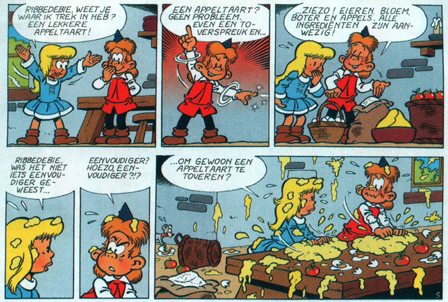 'Ribbedebie'. The boy uses a magical spell to make the ingredients for an apple pie appear, but his friend wonders whether it wouldn't have been better if he simply used a spell to make an apple pie appear instead?