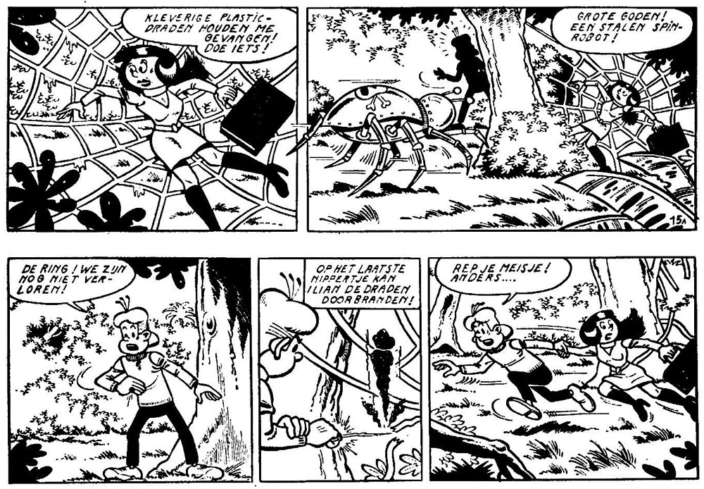 In 1984, Eric De Rop also renewed his association with Studio Vandersteen. Among his first tasks was reworking 'Jerom' stories that were originally created for the German market into a suitable format for the Flemish book publications. The first 'Suske en Wiske' story inked by Eric De Rop was 'De Bevende Berken' (1984), an advertising comic made exclusively for the washing powder brand Dash. He also provided the pencil art for the first seven pages, while Anita Schauwvlieghe also did part of the inking. De Rop then helped with the finished art of the sketches of 'De Ruige Regen' (1985), one of the few 'Suske en Wiske' stories written and drawn by Willy Vandersteen personally since his retirement from the series in 1972. Together with fellow studio worker Eugeen Goossens, De Rop provided the artwork for 'Suske en Wiske' advertising comics like 'Sony San' (1986), 'Witte Zwanen, Zwarte Zwanen' (1987) and 'Fata Morgana' (1988). De Rop also inked the first three stories of Vandersteen's new historical series 'De Geuzen' (1985-1986), but left this series to become Paul Geerts' regular inker on the main 'Suske en Wiske' comic. He replaced Eugeen Goossens, who in turn was assigned to 'De Geuzen'. The first 'Suske en Wiske' episode that De Rop inked for Paul Geerts was 'De Woeste Wespen' (1987).