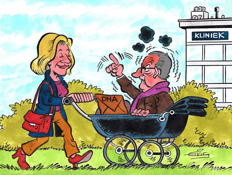 Cartoon for 't Pallieterke (November 2018), depicting former Belgian king Albert II being carried around in a pram by his illegitimate daughter Delphine Boël, after DNA tests proved she was indeed his biological daughter.