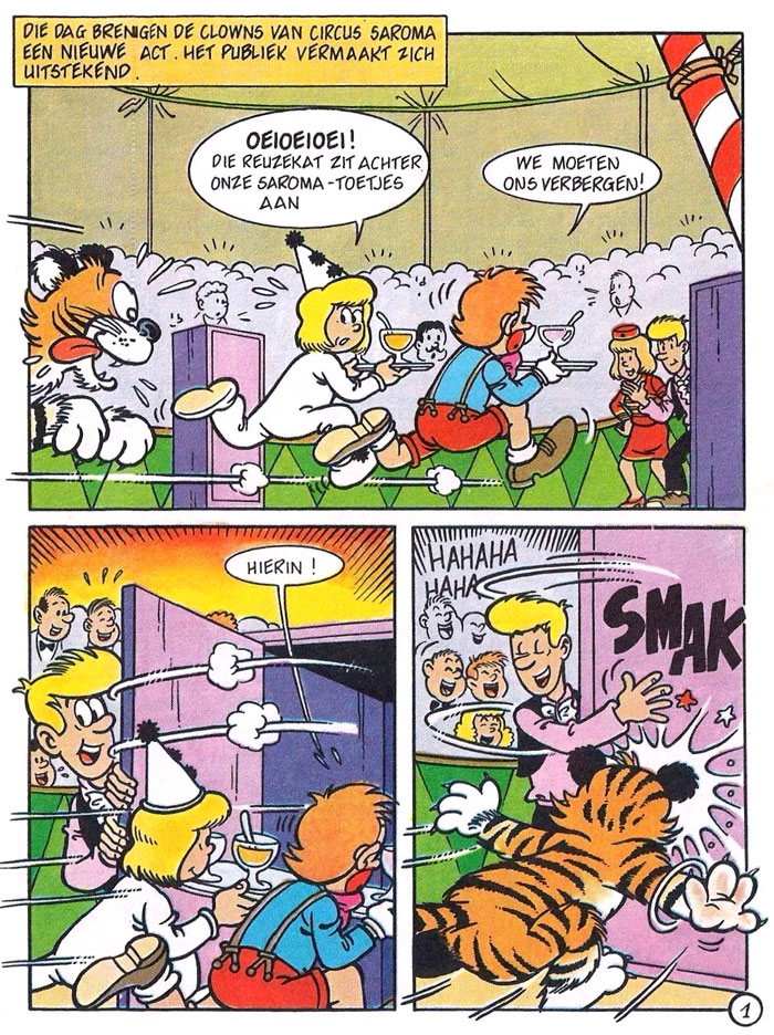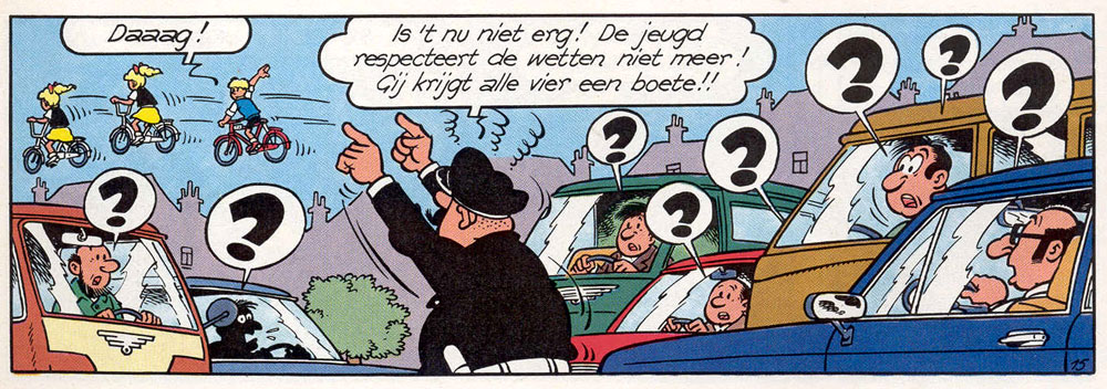 Between 1976 and 1982, De Rop left Studio Vandersteen for the first time, to join the team of another successful Flemish comic artist, Jef Nys. In Nys's Antwerp studio, De Rop spent six years serving as a background artist for the highly popular 'Jommeke' comic. While De Rop enjoyed working for Jef Nys, the artwork standards were a lot higher than at Studio Vandersteen. Nevertheless, he was allowed to draw a couple of 'Jommeke' stories on his own, such as 'Drie In Eén Slag' and 'De Vliegende Brigade', and six short stories made for advertising purposes, such as 'De Regenbom'.
