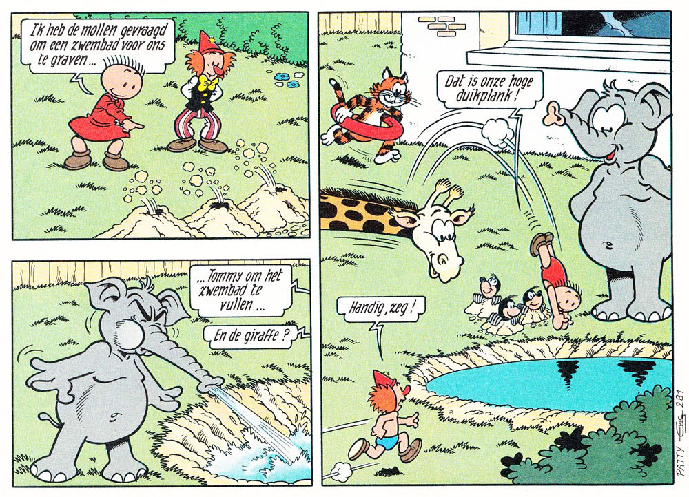 Eric De Rop had the honor of drawing the final comic series launched by Vandersteen himself: 'Schanulleke' (1988-1998), a spin-off around Wiske's rag doll. Originally, the concept started as two illustrated children's adventure books created by Willy Vandersteen himself, 'Schanulleke in de Dierentuin' (1986) and 'Eiko de Wijze Boom' (1986). For this spin-off, the veteran comic artist gave Schanulleke a male sidekick, the clown doll Duddul. On 27 December 1988, 'Schanulleke' became a one-page gag-comic for young readers, scripted by Dutch comic writer Patty Klein, and drawn by Eric De Rop. Anita Schauwvlieghe assisted on the backgrounds and inking. All episodes take place in a domestic setting, usually the house or the garden, where Schanulleke and Duddul interact with anthropomorphic animals like the striped cat Ponpon. The 'Schanulleke' gags were published in De Stipkrant, the children's supplement of newspaper De Standaard, as well as the Dutch toddlers' magazine Okki. Later on, the series was also reprinted in Suske en Wiske Weekblad and in Minitoe, the children's supplement of the Dutch newspaper Nieuws van de Dag.
