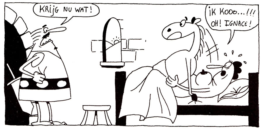 De Cuyper's 'Baron Ignace Karnemelk - De Steen der Wijven' is set in an anachronistic version of the Middle Ages. The title character is fed up with catching his brides in bed with his favorite horse Eddy. To win his current wife Anita back, the disgruntled nobleman goes on a quest to find the "Wives' Stone" ("Steen der Wijven", a pun on "Steen der Wijzen", the Dutch phrase for the Philosopher's stone). At the time, the story was described in press releases as a cross between Kamagurka and Pirana's work. Indeed, De Cuyper applied a loose graphic style with witty non-sequiturs, daft dialogues and bawdy comedy.