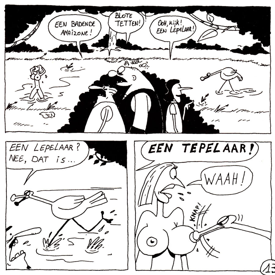 'Baron Ignace Karnemelk - De Steen der Wijven'. The baron corrects his friend that he hasn't spotted a "lepelaar" ("spoonbill"), but a "tepelaar" (pun on the word "tepel", meaning "nipple").