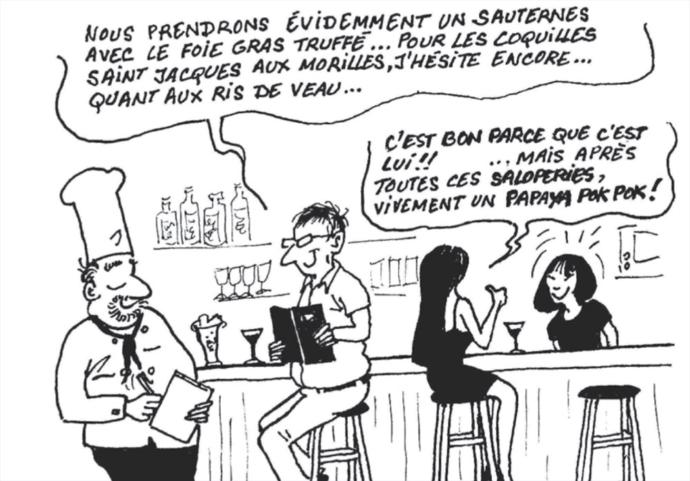 Translation: Man: "Obviously we'll have Sauternes with the truffled foie gras... I'm still undecided about the scallops with mushrooms... and as for the sweetbreads...