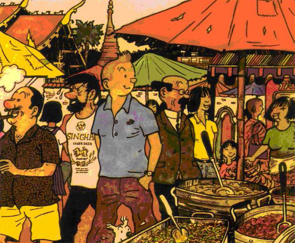 Dutch painter Peter Klashorst , who also lived in Thailand in later life, once painted an altered version of Filip Denis' 'Tintin' sex parody 'Tintin in Switzerland', but retitled 'Tintin in Thailand' as an extra nod to Baudouin de Duve's other 'Tintin' sex parody.