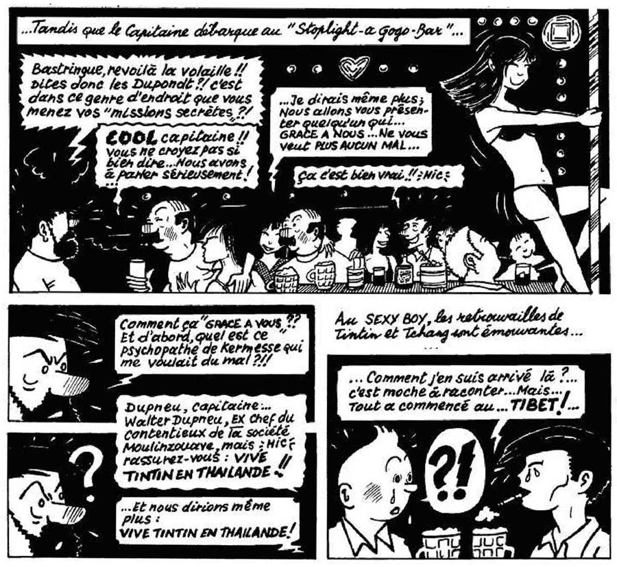 In 1994, De Duve discovered the existence of Filip Denis' infamous 'Tintin' parody 'Tintin en Suisse' ('Tintin in Switzerland', 1976), which he felt was "badly drawn and very vulgar". But it gave him the idea to create his own 'Tintin' parody, which nevertheless still took six years to produce, due to personal issues. In 1999, 'Tintin in Thailand' hit the market, published under his pseudonym Bud E. Weyzer (a pun on the beer brand Budweiser). The story takes Tintin, Captain Haddock and Professor Calculus to Bangkok, where they search for Séraphin Lampion (Jolyon Wagg), who went missing. Despite De Duve's bad review of 'Tintin in Switzerland', his own parody comic really isn't that much more professional or tasteful. 'Tintin in Thailand' features a lot of clumsily traced drawings and random cameos of familiar Tintin characters. The plot brings the protagonists to Bangkok's red light district where they pick up prostitutes and transsexuals. General Alcazar turns up as the owner of a go-go bar, while Bianca Castafiore sings in a nightclub band called the Blue Lotus. Tchang Tchong-Yen has a surprise visit, claiming he was sexually molested by the Abominable Snowman.