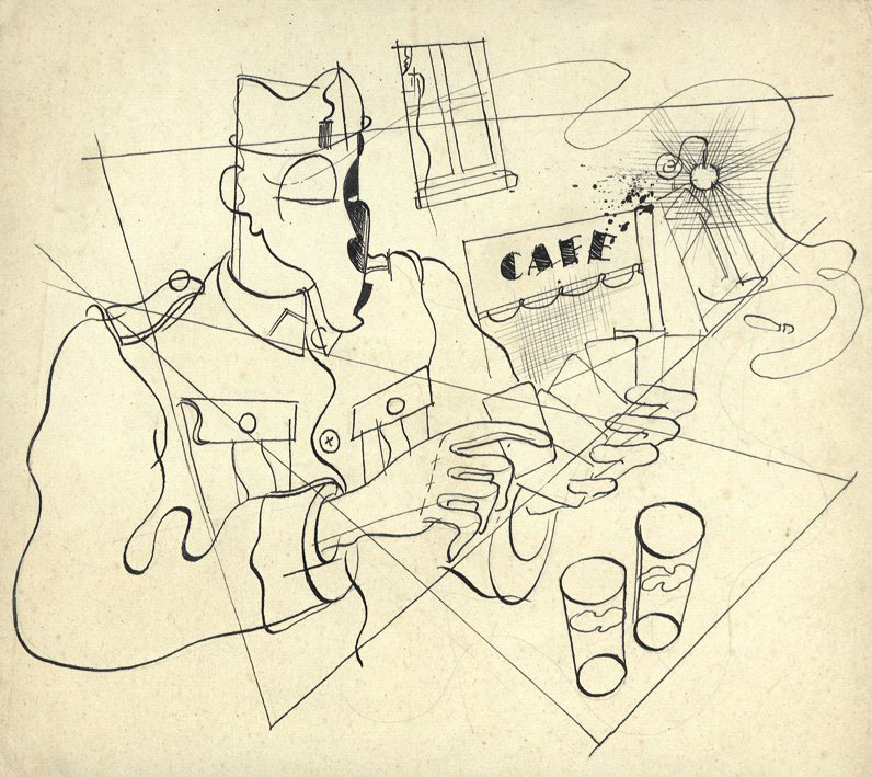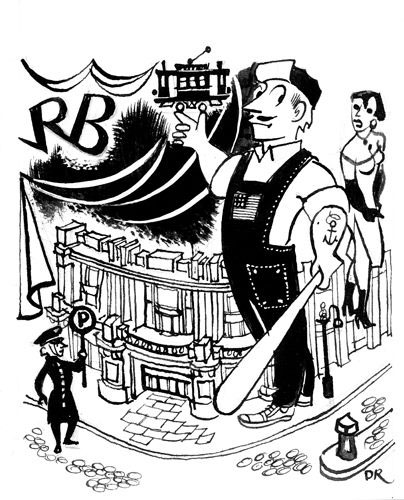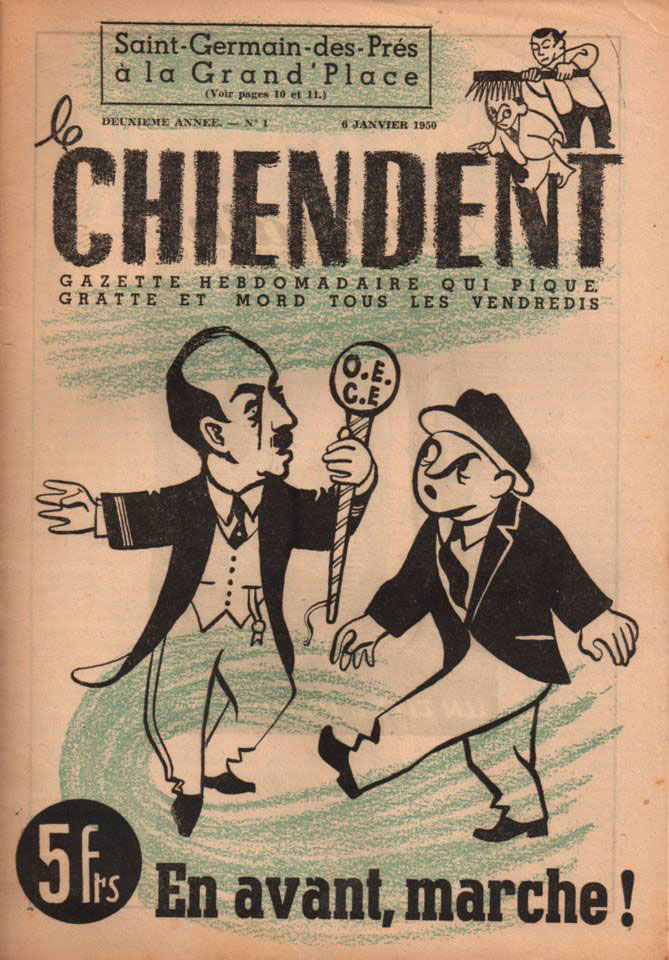 Cartoon for Pan magazine and cover art for the 6 January 1950 issue of Le Chiendent. The mustached man on the latter cover is politician Paul van Zeeland.