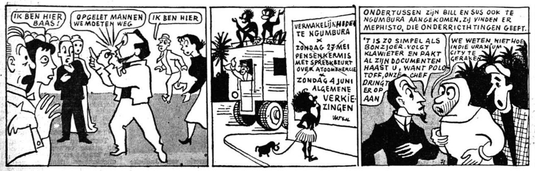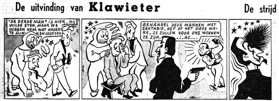 The editors of Het Nieuws Van Den Dag quickly searched for a replacement comic. They found two artists willing to create a humorous adventure series, Lucien De Roeck and Raf Van Dijck. Under the pen name Luc Droek, De Roeck created the one-shot comic serial 'De Strijd Om Het Uranium' (1950), scripted by former Marc Sleen collaborator Gaston Durnez. Serialized in Het Nieuws Van Den Dag from 23 March until 8 June 1950, 'De Strijd Om Het Uranium' stars the absent-minded professor Klawieter and his friends, who travel to the Belgian colony Congo to find uranium. The story makes some nods to then-current political issues, like the Royal Question crisis which divided post-war Belgium. As can be expected from a Catholic newspaper from that era, it also features a lot of jokes at the expense of all other Belgian political parties. Neither Van Dijck's comic 'Kwik en Filidoor' nor De Roeck's 'Klawieter' really caught on with readers. Both artists were therefore replaced by the newspaper for the more experienced comic artist Bob de Moor, who drew the satirical political series 'De Nieuwe Avonturen van Tijl Uilenspiegel' (1950-1951), followed by his more apolitical humorous adventure comic 'De Avonturen van Nonkel Zigomar, Snoe en Snolleke' (1951-1956).