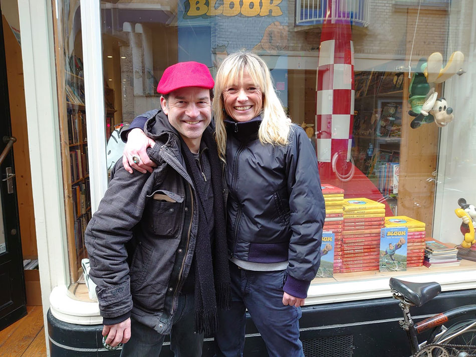 Vick DeBergh and Babiche Bakker in front of Lambiek, 3 March 2020. On 6 March of that year, Debergh presented his latest book, 'Blook' in our store.