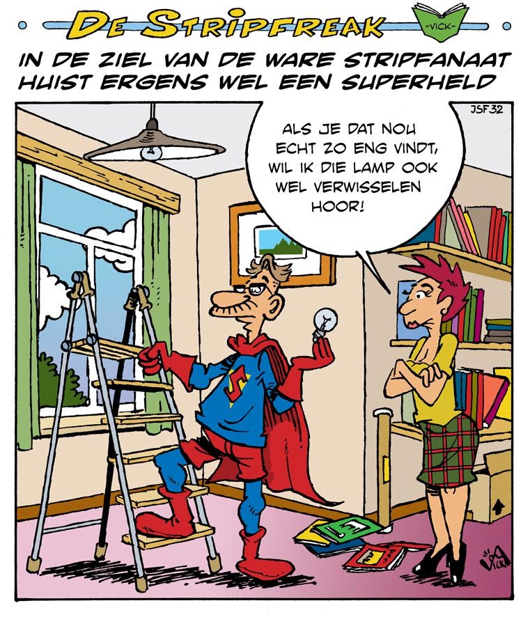'De Stripfreak'. Translation: "Somewhere in the soul of the true comics fan a superhero is hidden." - "If you really find it that scary, I'm willing to change that lamp for you."