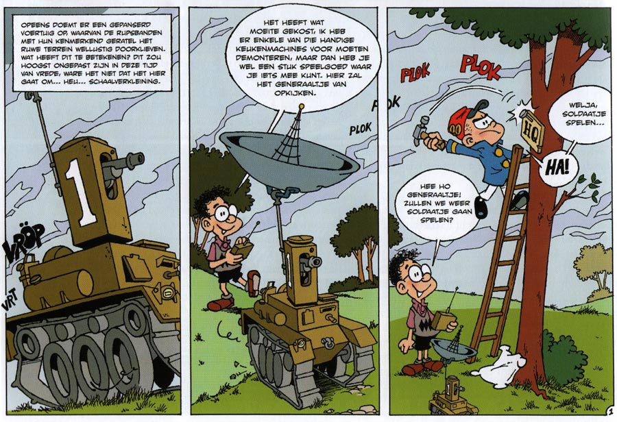 Debergh's main graphic influence is Peter de Smet, the legendary Dutch comic artist known for his gag comic 'De Generaal', which ran for decades in Eppo magazine. Each episode featured a dumb general trying to stage a military coup on a fort, but failed no matter how he tried. In 2016, when De Smet's signature comic celebrated its 45th anniversary, Debergh drew a special homage episode of 'De Generaal', printed in Stripglossy #1. In 2018, he expanded on this idea, again in Stripglossy, launching a tribute comic feature about De Smet's power-hungry general in his younger years. It turned out that De Generaal and his cronies were already trying to conquer the fort since childhood, which makes their adult efforts even more tragicomical. In addition to his comic stories, Debergh also constructed a remote-controlled miniature version of the general's trademark tank.