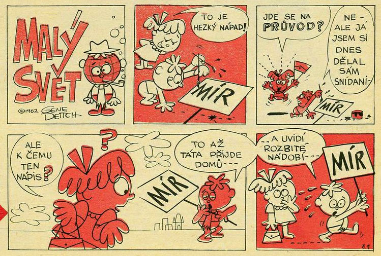 'Maly Svet', 1962. The boy makes a sign with the word "peace" on it. The girl says: "Great idea! There will be a demonstration!" The boy corrects her: "No, no, it's just that today it was my turn to prepare the table for dinner." When the girl asks him what this has to do with the sign he replies: "It's protection for when my dad returns home... and notices I broke six dishes...".
