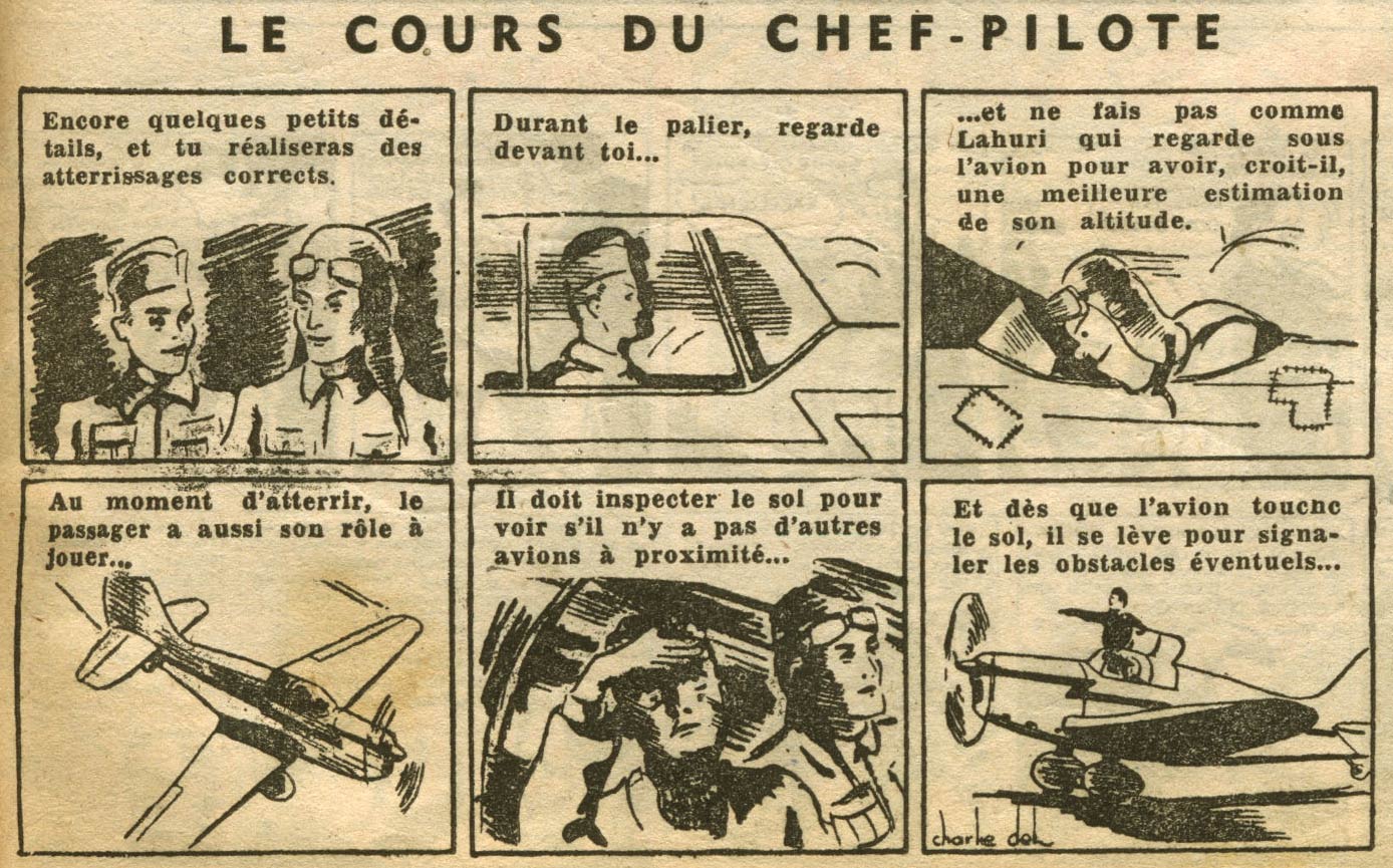 In Spirou magazine, Delhauteur illustrated the aviation section, as well as an educational strip about the subject called 'Le Cours du Chef-Pilote' (1942-1943). This latter feature ran since late 1941, and was initially credited to Pec (Al Peclers) and Georges Cel (Troisfontaines himself). The signature of "Charlie Del" first appeared in the Spirou issue of 16 April 1942. Later installments of Spirou's "aviation club" were illustrated by Jean-Michel Charlier, who sometimes used the pen name Flettner.