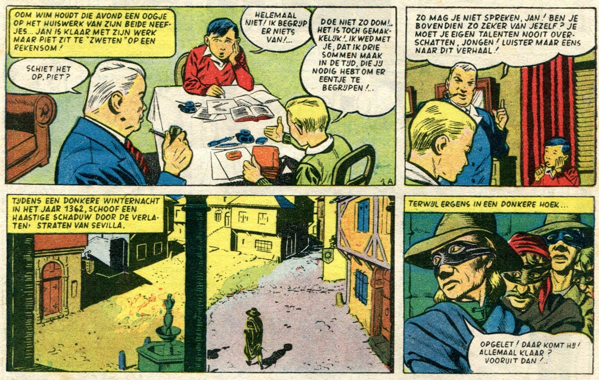 Under the pen name "Hope", Delhauteur drew the four-page comic story 'Gouverneur Malgré Lui' (#678, 1951), one of the early installments of the educational comic feature 'Les Belles Histoires de l'Oncle Paul', written by Jean-Michel Charlier. The story was also featured in the twelfth volume of the 'Oncle Paul' book series, 'Chasseur de Tombeaux' (Dupuis, 1955). Early on, most of the 'Oncle Paul' stories were drawn by Eddy Paape, gradually followed by new World's Presse artists like Dino Attanasio, Jean Graton, MiTacq and René Follet. Delhauteur also provided occasional assistance on the 'Buck Danny' aviation comic by Hubinon and Charlier, and was the regular illustrator for the educational section 'Le Coin des Petits Curieux' in 1957-1958.