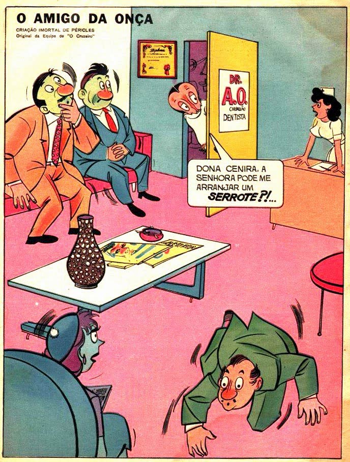 In the early 1960s, Delphim was working for the publishing house O Cruzeiro, where his work appeared under the joint pen name "Equipe de O Cruzeiro" with Zé Geraldo and possibly other artists. The team illustrated comic stories based on the 'Charlie Chan' franchise, originally created by American novelist Earl Derr Biggers, for the magazine O Guri. These locally produced detective stories succeeded the American material from DC Comics, and were situated in Rio de Janeiro. In the publisher's main title, the magazine O Cruzeiro, Delphim and Geraldo continued the satirical humor feature 'Amigo da Onça' after the suicide of Delphim's friend Péricles Maranhão on New Year's Eve 1961. Their run lasted two years, after which Carlos Estevão continued the feature from 1964 to 1972.