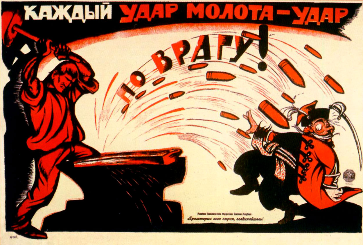 "Every Blow of the Hammer is a Blow Against the Enemy!" (1920), a well-known early Soviet propaganda poster by Viktor Deni, depicting a proletariat smith hammering away at an anvil. The sparks have the shape of bullets and fire away at one of the czar's generals.