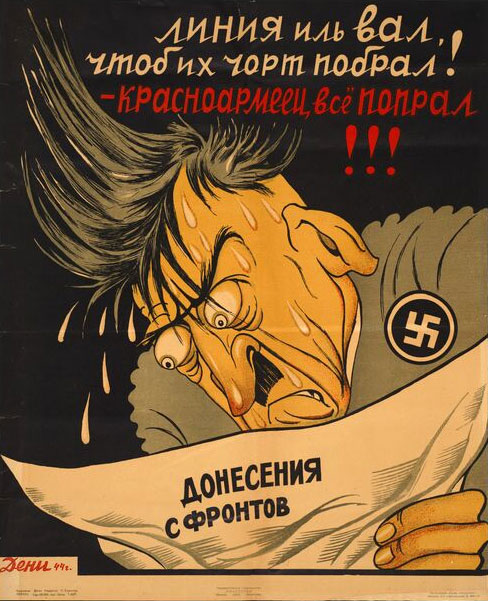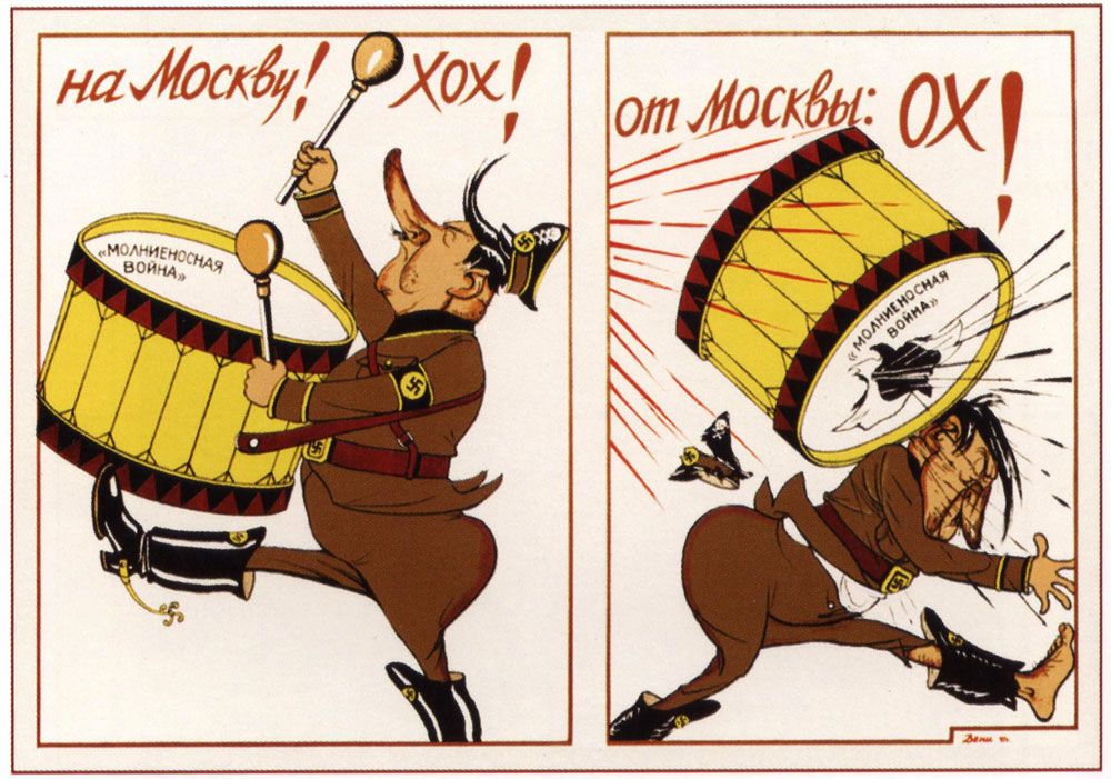 In 1941, Hitler invaded the Soviet Union, which led to a massive retaliation campaign by the Russian army. Deni inspired his fellow countrymen through many powerful posters and cartoons glorifying the Soviet army and ridiculing Hitler and Nazi Germany. One of these, 'To Moscow! Hoch! From Moscow! Oh' (1941) is a "before and after" cartoon told in two panels. The first image shows Hitler marching the drum to conquer Moscow. The next image shows him bruised, battered and fleeing back home again. Deni's prediction eventually came true, as the Russian troops pushed the Nazis back to Berlin. He made two other "before and after" cartoons, ridiculing Hitler. In 1943, he drew one where Hitler is shown as a proud king in the first panel and beaten up, with a bandaged nose in the second. A similar joke can be found in '1941: to the East! 1944: to the West!' (1944). In the first panel - 1941 - the Führer looks determined, with a plaque around his neck, which reads "Slavery for the People". In the second - 1944 - he sulks under the Russian sword of revenge.