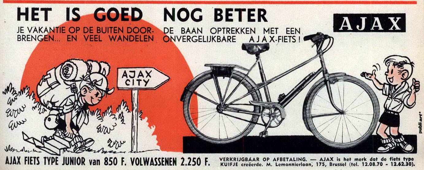 Publiart advertisement for Ajax bicycles (1959). Artist unknown, maybe Tibet? Dutch-language version.