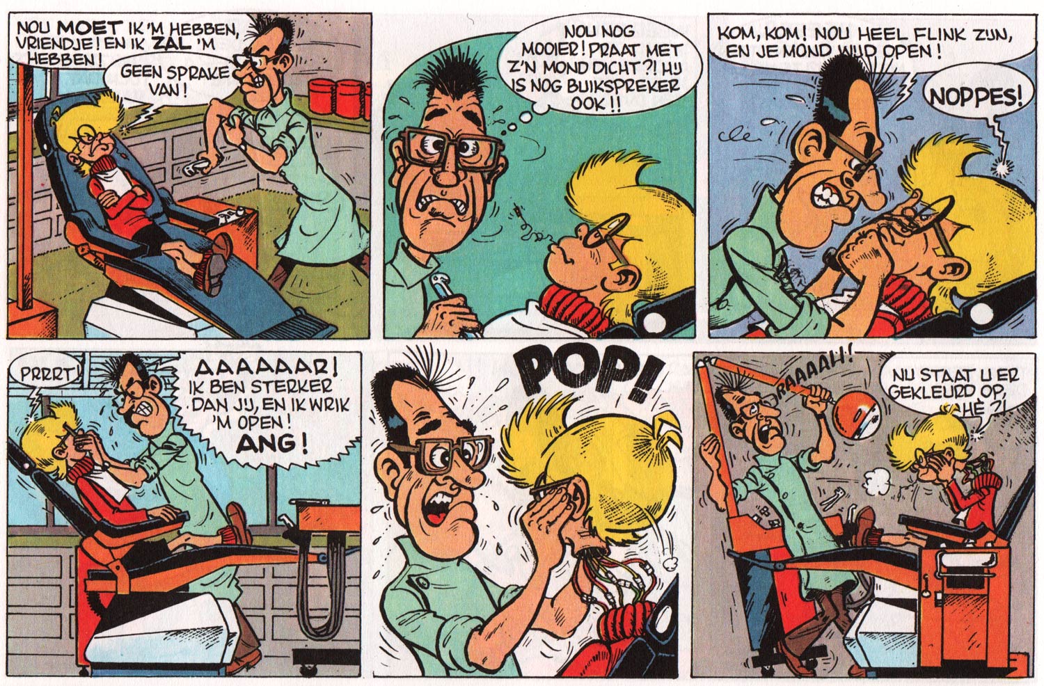 In addition to his work for Dupuis, Devos created two albums of the spy parody 'Steve Pops' (1966-1967) for Casterman. Steve Pops is the secret agent H2O of Na2S, a British counter-espionage service. A master of disguise, hand-to-hand combat and firearms, he is known for his clothes, his cakes, and his impressive beard, which grows rapidly throughout his adventures. The Steve Pops adventures were parodies of the James Bond films starring Sean Connery - the first book was called 'Steve Contre Dr. Yes' - while incorporating elements from other famous spy series such as 'The Man from U.N.C.L.E'. In 2015, the Coffre à BD imprint re-released the two albums.