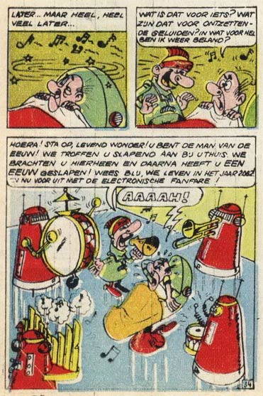 Between 1969 and 1972, Devos produced several humorous and often absurd comics for Spirou, which appeared under the title 'Farfeluosités de Devos'. The stories featured a wide range of imaginative creatures and surreal settings, while the artist also toyed with perspective and anatomy. A book collection appeared in 1984, in the 'Carte Blanche' collection of the publishing house Dupuis. These experimental stories can be considered forerunners of Devos's best-known creation, 'Génial Olivier'. The genius boy had already starred in three mini books during the 1960s; the first was included in the 1321th issue of Spirou on 8 August 1963. Prior to his debut in Spirou's regular pages, 'Génial Olivier' additionally appeared in the 97th issue of the monthly Samedi-Jeunesse in November 1965 in a special 18-page story.