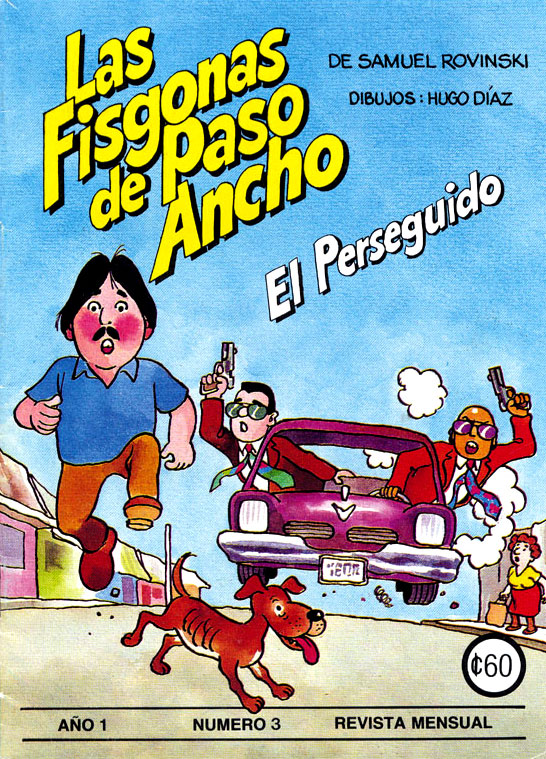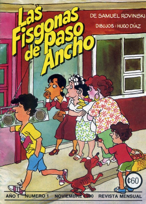He later also published cartoons in La República (under the pen name Lalo), Inter-American Marketing, 8días and Voz de ANDE. Selections of his work were compiled by Editorial Costa Rica in the books 'El Mundo de Hugo Díaz' (1978) and 'Díaz todos los días' (1995). For the magazine Gentes y Paisajes he made the full-color comic page 'Baldomero y Emeterio' (1976-1978) with writer Miguel Salguero, as well as the section 'Da gusto vivir en mi tierra' ("It's nice to live in my country"). In the mid-1980s he worked with playwright Samuel Rowinski (sometimes spelled 'Samuel Rovinski') on three issues of a comic book based on Rowinski's stage play and subsequent TV series 'Las Fisgonas de Paso Ancho'. It can be considered Costa Rica's first national comic book.