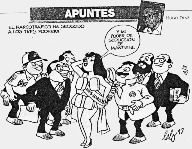 One of Díaz' favorite targets was former president José (Pepe) Figueres Ferrer, who was in office from 1948 to 1949, 1953 to 1958 and 1970 to 1978. He has drawn the man so often that an exposition called 'José Figueres en la pluma de Hugo Díaz' ("José Figueres from the pen of Hugo Díaz") was held in the Galería de Arte José Figueres in 1991. It was only one of many expositions which showcased the work of Hugo Diaz Jiménez, both in and outside of his home country. Throughout his career the artist received many awards and distinctions. Already in 1970 he won the first prize in the Noé Solano Annual Cartoon Salon. He entered second in the category editorial cartoon at the 1972 International Salon of Cartoons in Montreal, Canada. The Costa Rican Human Rights Commission (of which he was a founding member), Amnesty International and the National Institute of Insurance sponsored the exhibition 'Los Derechos Humanos en las Caricaturas de Hugo Díaz' ("Human rights in the cartoons of Hugo Díaz") in 1994.