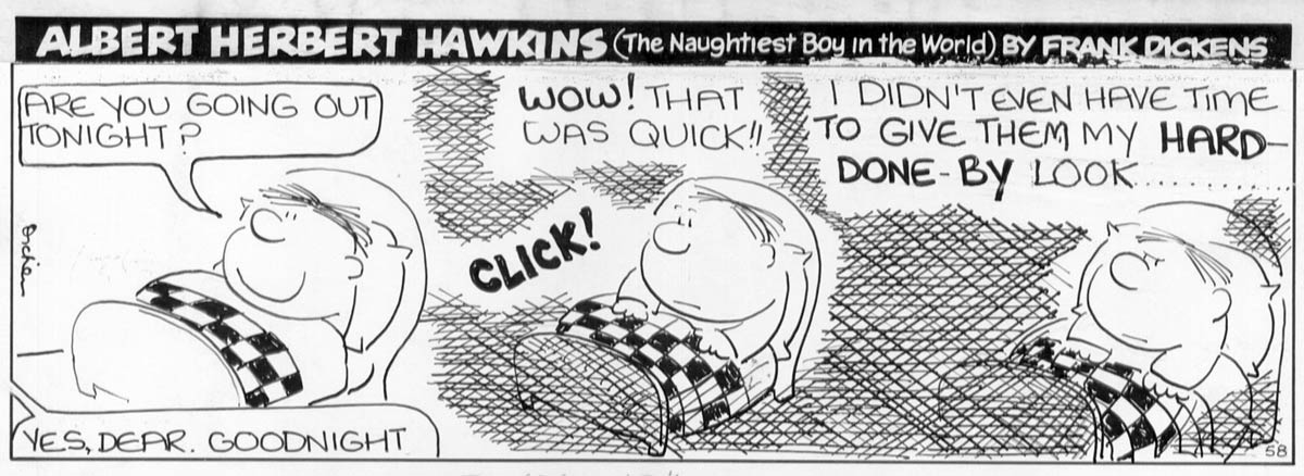 Dickens' most widespread comic strip (albeit for a short while) was 'Albert Herbert Hawkins (The Naughtiest Boy in the World') (1967-1987), which featured the daily events of a young boy at Saint Mary's Mixed Infants School. It ran in The Daily Express for 20 years. Like the title implies, Albert is a disobedient boy who often rebels against his parents, teachers, policemen and other adults. Dickens once said that the character expressed his own "true character" and that he preferred it above 'Bristow'. The comic was syndicated in the United States by Field Enterprises to about 200 papers between 12 February 1979 - at earliest date - and 11 February 1980 - at latest date-, according to the research of Allan Holtz of the Stripper's Guide blog. In some U.S. school libraries at the time, 'Albert Herbert Hawkins' was banned, because it supposedly promoted "defiance of adult authority by showing misbehavior for which the protagonist goes unpunished."