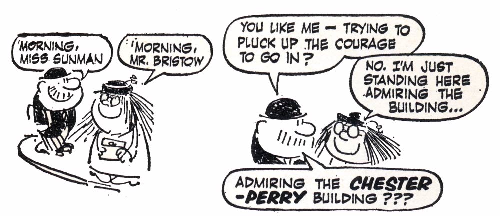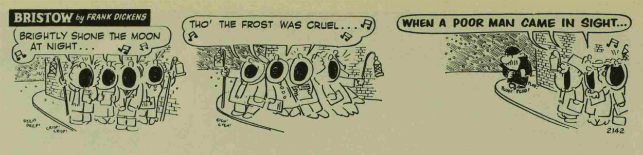 On 19 September 1961, 'Bristow' debuted in regional papers like Preston Journal, Aberdeen Press, Glasgow Evening Citizen and the Western Mail, before being picked up exclusively by The Evening Standard on 6 March 1962. Dickens wrote it in collaboration with his sister Pam. The gag-a-day comic stars a round, bulbous character Dickens had used before in his 'Oddbod' comic, but now received a proper name and personality. Bristow is an employee at the city conglomerate Chester-Perry, where he works under command of Mr. Fudge. Dickens took the name 'Bristow' from a nondescript name in a Michael Ffolkes cartoon. His co-workers are the clerk Jones (who always claims that he is seven years older than Bristow), typist Miss Sunman, master chef Gordon Blue, the Postboy and Mrs. Purdy the Tealady, who enjoys gossip.