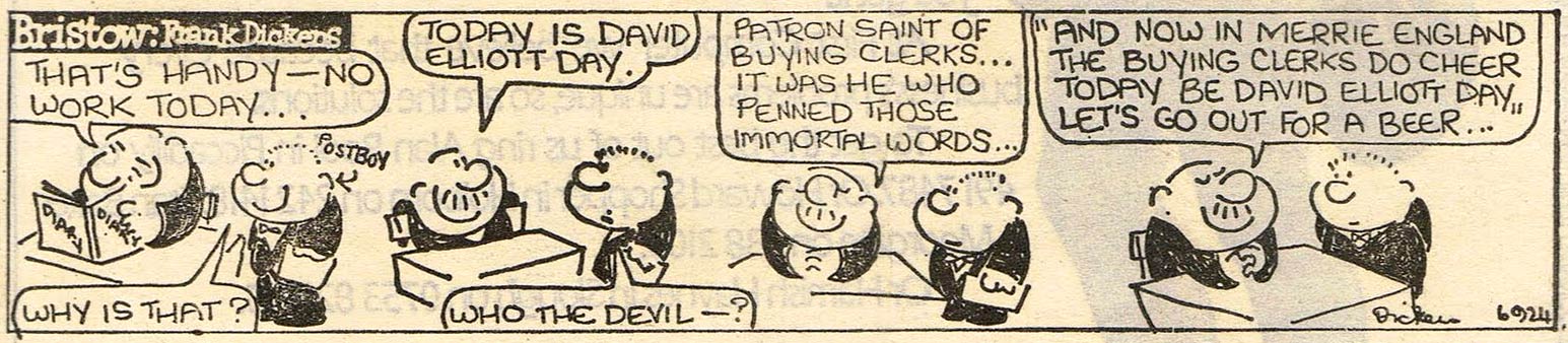 Bristow may look like a model worker (complete with bowler hat), but in reality he tries to avoid doing any useful work. He talks with colleagues, gets distracted by a pigeon on his windowsill, dreams of becoming a novelist or brain surgeon and usually arrives late at work "thanks to the railways." Bristow daydreams about his future best-selling autobiographical novel 'Living Death in the Buying Department' and Miss Pretty, the 'Kleenaphone' girl on whom he has a crush. Dickens even found a way to shoehorn his love for cycling in the comic, giving some side characters the names of well known real-life cyclists. The 'Bristow' feature was syndicated worldwide, except in the US, because Dickens refused to "Americanize" his characters. Notable foreign publications that ran Dickens' strip are the Melbourne Herald and the Sydney Morning Herald from Australia, The Dominion in Wellington, New Zealand, and the Italian magazine Linus. Between 1966 and 2011, twelve 'Bristow' compilation books were published.