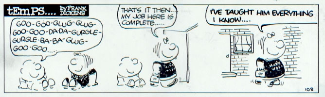 Interestingly enough, Dickens started to hate his own comic strip after a while. He usually created all six daily episodes within one Monday morning, so he could spend the rest of the week doing other things. According to the Evening Standard: "Frank's working week is as follows: Monday: Up at 5.45 a.m. Thinks up six 'Bristow's. Draws them. 9.00 a.m.: faxes them to office. End of working week." He once described Bristow in a 1980 interview, conducted by Alex Hamilton, as "an awful character, really - heartless, cruel. Y'know, kick a man when he's down sort of thing." Especially in the 1980s, after Dickens and his wife divorced many cartoons became quite nihilistic, with Bristow suffering from depression himself and sometimes even contemplating suicide. Luckily, the tone changed again by the 1990s.